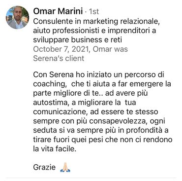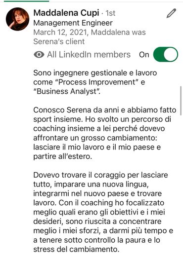 Dopo oltre 10 anni di studio, di esperienza aziendale e di vita, dopo lauree e master conseguiti in Italia e all'estero, ho capito che la mia strada era il coaching e ho così preso il coraggio di rivoluzionare la mia vita per costruire un progetto autentico, più in linea con la vera me e, finalmente, in armonia con la mia anima.